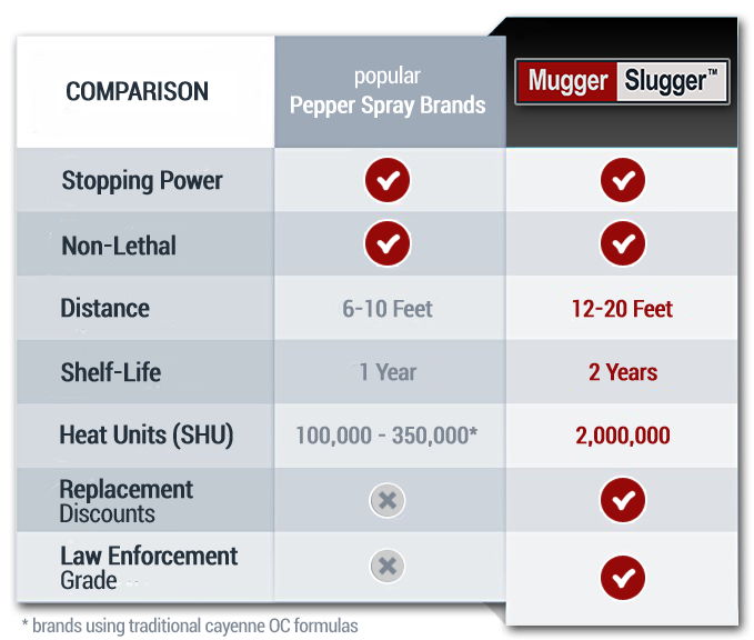 Every Mugger Slugger carries a 2-year shelf life guarantee from date of purchase, compared to the competition, which only guarantees their pepper spray for 1 year.
